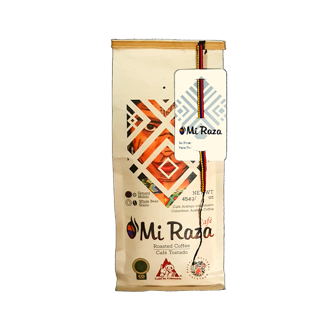 Café suave de origen Colombiano. Cada bolsa trae tarjeta de regalo con una manilla original hecha por una mujer indígena Embera.